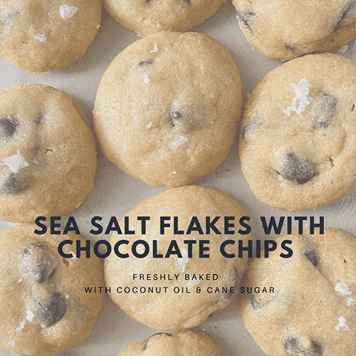Our best seller! Little sea salt flakes with a mystery surprise. If you prefer sweet but not too sweet then this will be the one. Premium coconut oil, premium cane sugar and premium butter too. Baked with lots of love and chocolate chips ~